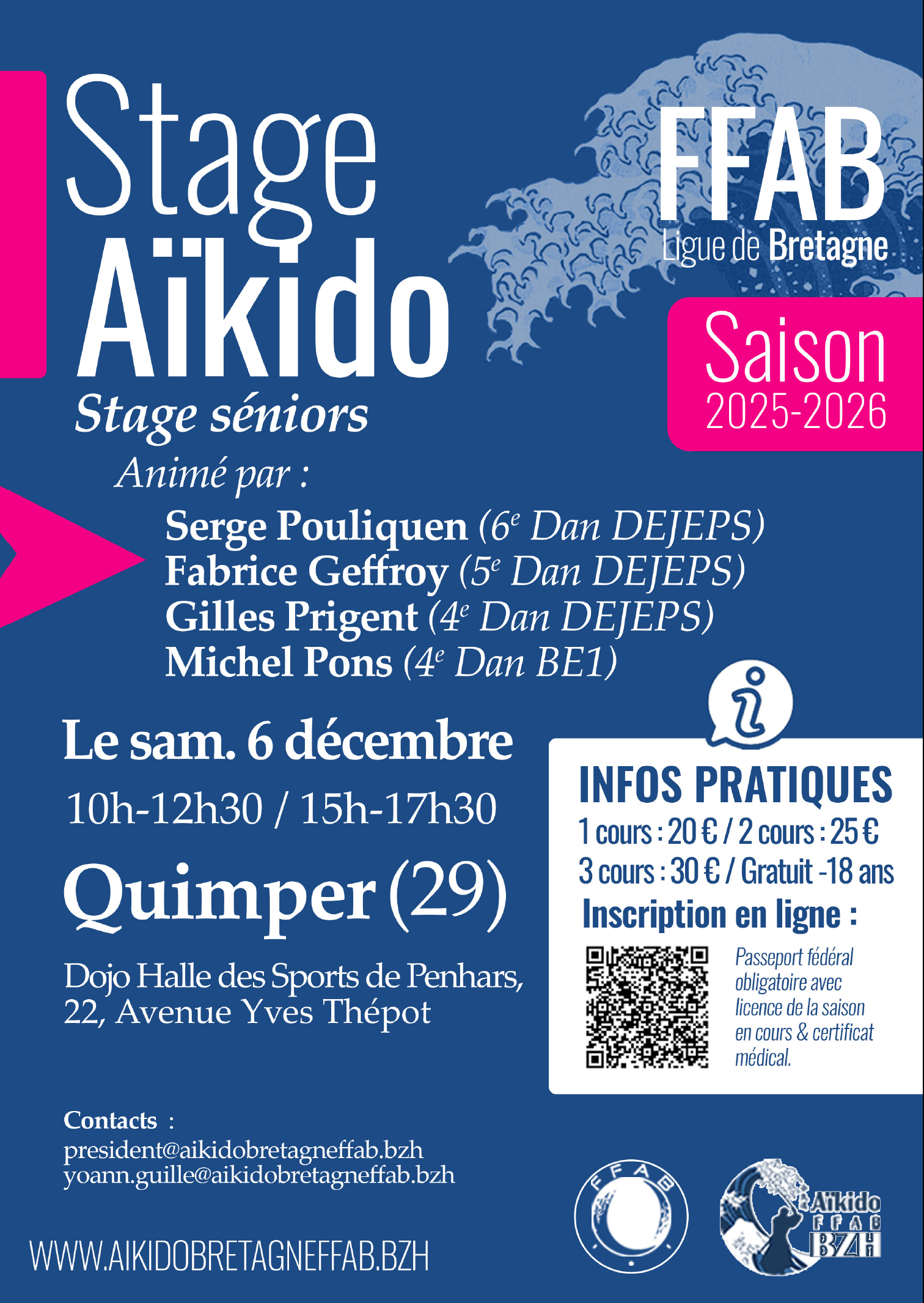 - Stage senior, samedi 6 décembre, Aïkido Quimper – Dojo de Penhars novembre 26, 2025