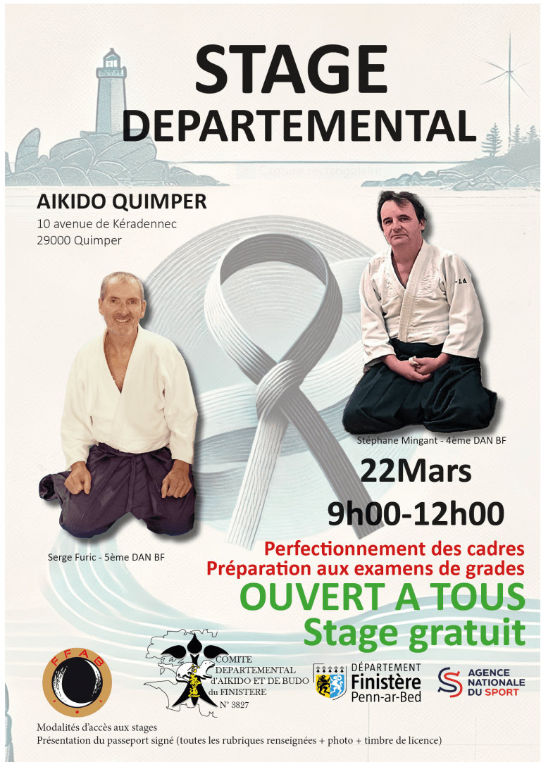 Le Comité Départemental d’Aïkido et de Budo du Finistère a le plaisir de vous inviter à son prochain stage départemental qui se tiendra le dimanche 21 décembre à Landerneau. Nous serons accueillis pour cette occasion par le club Aïkido Shobukan Landerneau à la salle La…